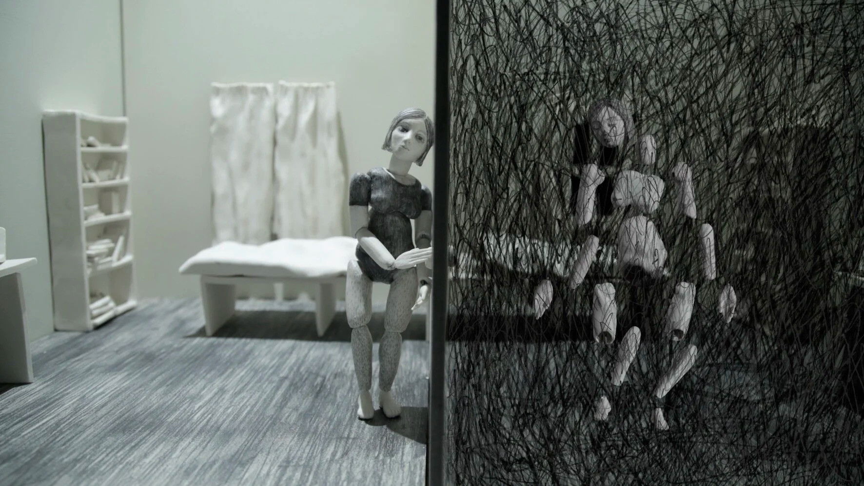 A woman discovers her own fractured self in the room next door. Body Echo expresses psychological fragility and fragmentation of identity.