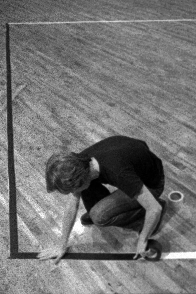 Black on White Tape begins with the camera pointing down at the floor where a roll of white tape is laid on top of a roll of black tape. Haxton enters the frame, picks up the white tape,and beginning at the lower left of the frame, tapes a line up along the left frame. He draws a line on the right,and then horizontal lines at the bottom and top, making a trapezoid. The re-iteration of horizontal and vertical frame lines inside the picture emphasizes the flatness of the projected image against the three-dimensionality of the experience of the room interior. There appears to be perceptual distortion: the top horizontal is wider than the bottom one, destroying the conventional perspective of spatial representation and reinforcing the flatness of the frame. This equivocation between flatness and spatiality is intensified by a cut to negative.